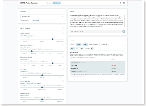 How do the NZF's design choices determine who bears the cost? The MEPC Policy Explorer lets users model how specific decisions still under negotiation — Fund revenue split, disbursement eligibility, delivery efficiency — shape economic outcomes for individual countries. Six interactive policy sliders produce real-time GDP, consumer price, and trade cost impacts, built on the IMO's Comprehensive Impact Assessment (Scenario 24). A companion Pathways module places the NZF in context alongside five alternative proposals currently on the table at the IMO, from adoption as drafted to complete abandonment. Full methodology documentation included.