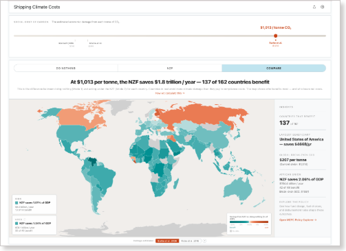 Shipping Climate Costs — look up the cost of climate inaction for any country, adjust the SCC, and compare against the NZF. 163 countries, three modes (Do Nothing / NZF / Compare), Burke and Ricke damage weight toggle.